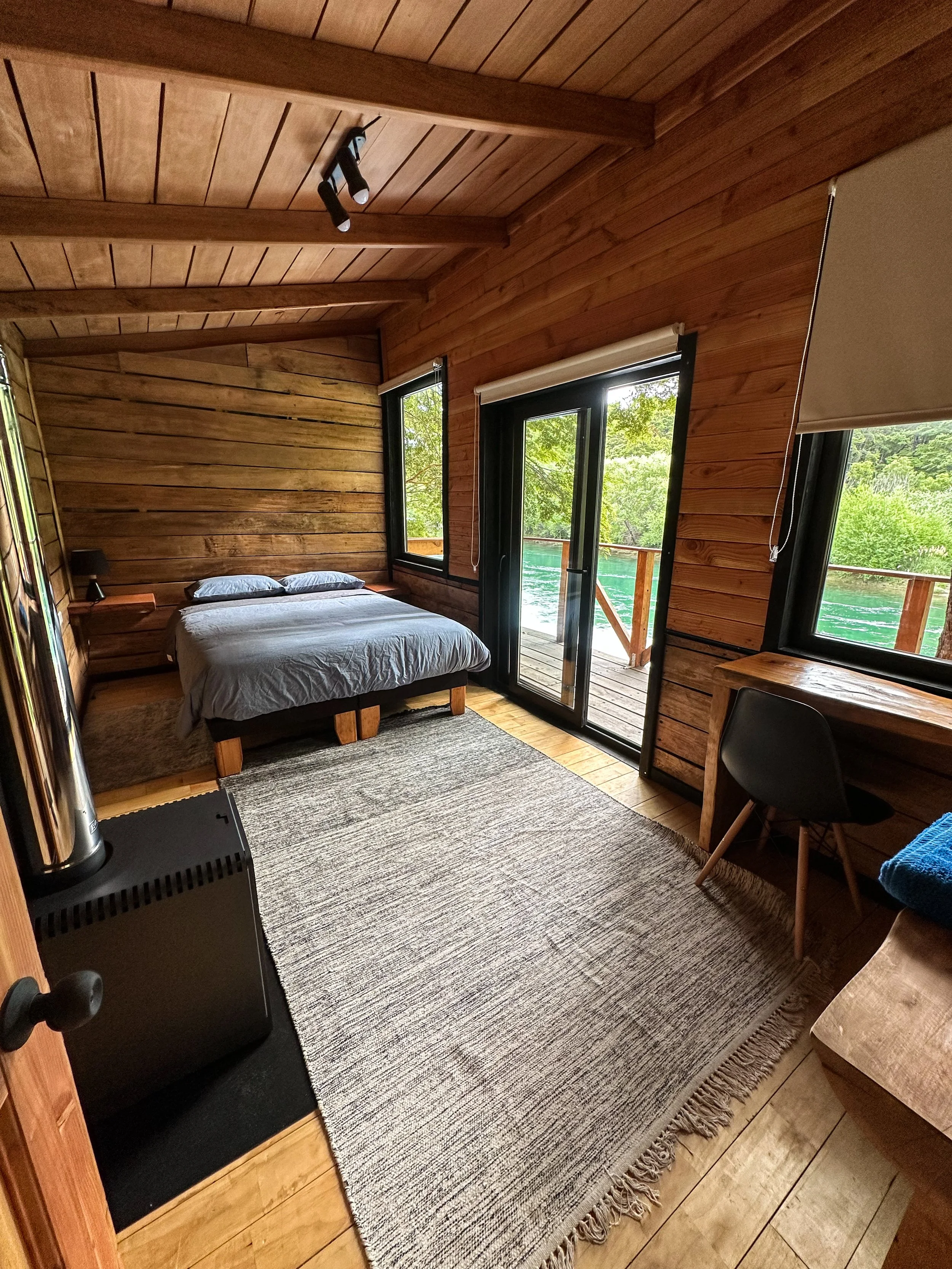 Our cozy cabins strike the perfect balance between glamping and comfort, featuring stunning views, super comfy beds, and peaceful spots to unwind. Thoughtfully designed with locally sourced materials and minimalist structures, our accommodations blend seamlessly into the natural surroundings, with the river and forest as a serene backdrop. Whether you're staying in a private cabin for restful seclusion or our kayak hostel-style shared quarters for a more social experience, there's a space for every kind of traveler